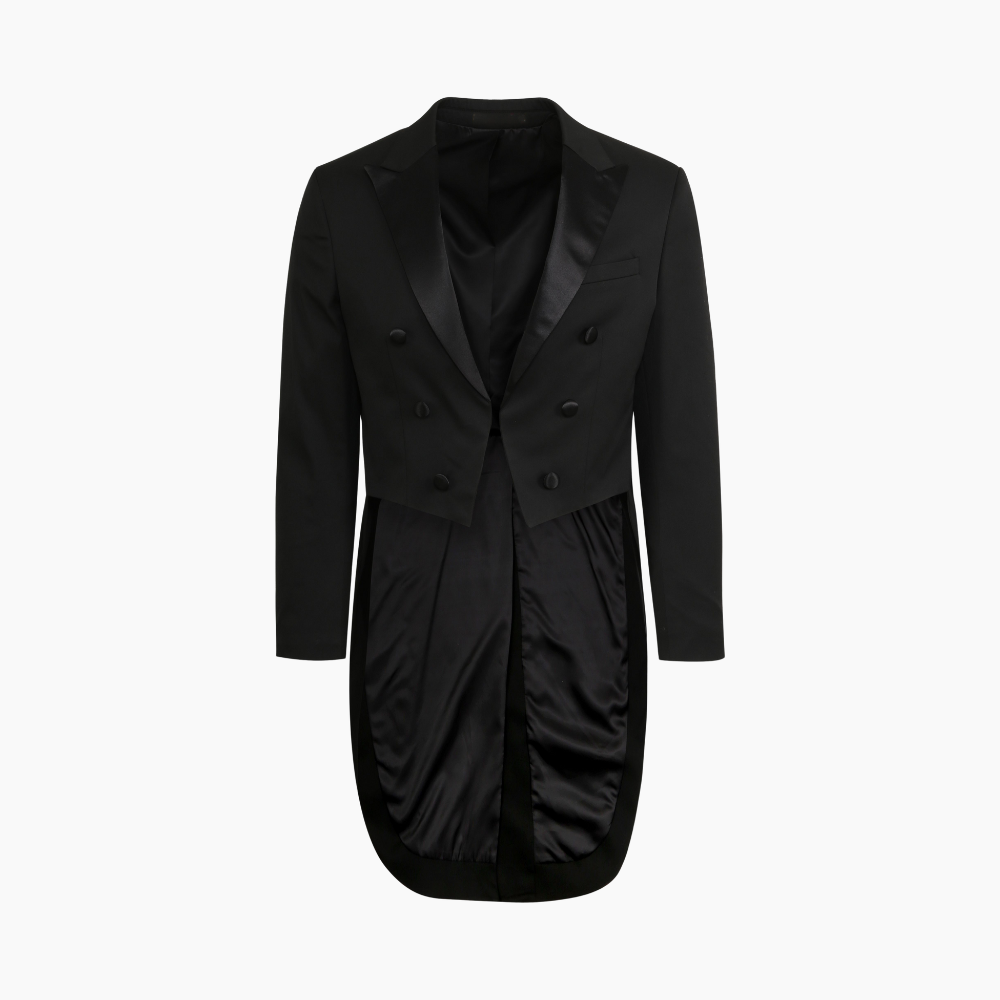 Frackkavaj: Svart med långa skört och sidenklädda slag. Kavajen knäpps aldrig.
